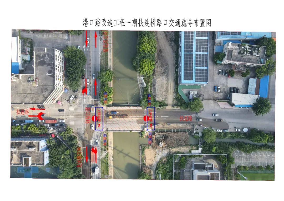 根据港口路工程改造建设需要,扶连桥拆除重建,计划自2025年8月5日起对扶连桥进行全封闭施工。为确保施工期间道路交通安全与畅通,现将有关交通疏解措施公告如下: