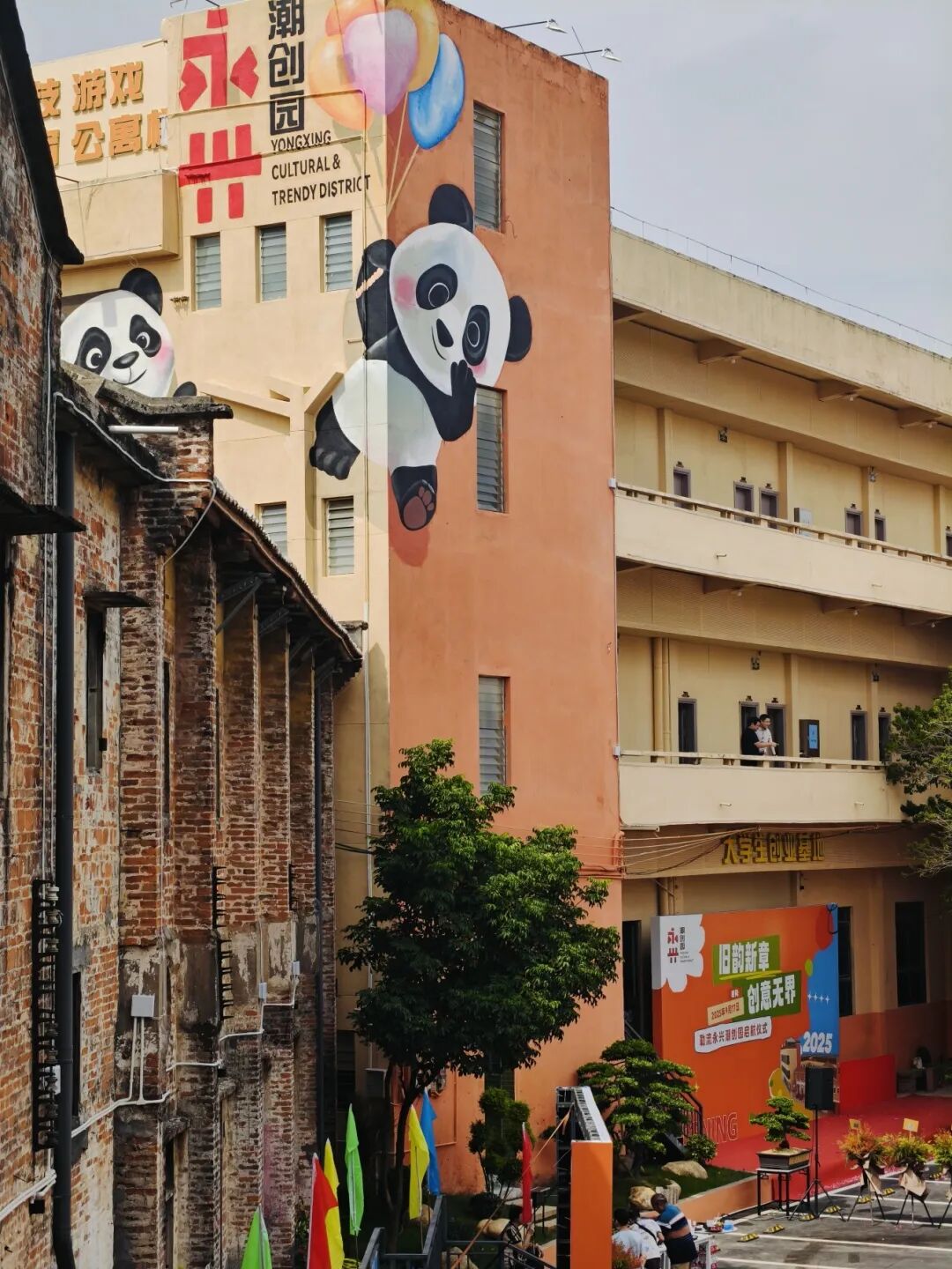 9大艺术打卡点:「未完成」摄影展、五金创新装置区、勒流字体涂鸦墙、3D立体舞狮壁画、咖啡公寓鱼缸墙、三角草坪休憩区、永兴街水运码头、趣味哈哈镜角落、“永熊”熊猫彩绘墙。