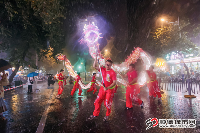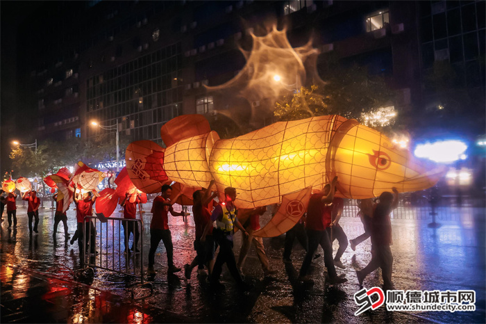 当晚,在一片祥和欢乐的中秋佳节气氛中,民俗大巡游如期启动。随后雨幕渐起,本应按下的巡游暂停键却未按下。风雨中,由非遗传承人潘智江老师团队制作的两条长达6米的大鱼灯——传统锦鲤灯与金色定制鱼灯,在雨中引领队伍,分别寓意“锦绣前程”与“金玉满堂”,更象征顺德人无惧风雨、坚持传承优秀传统文化的精神。