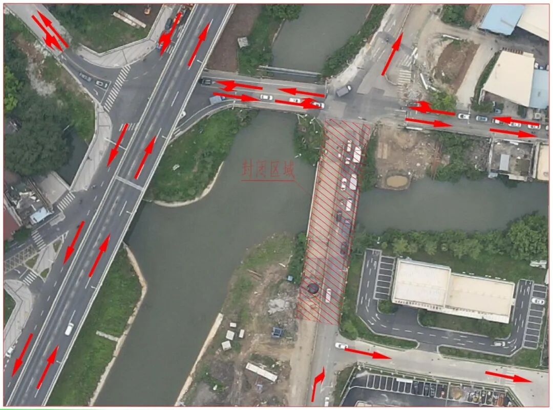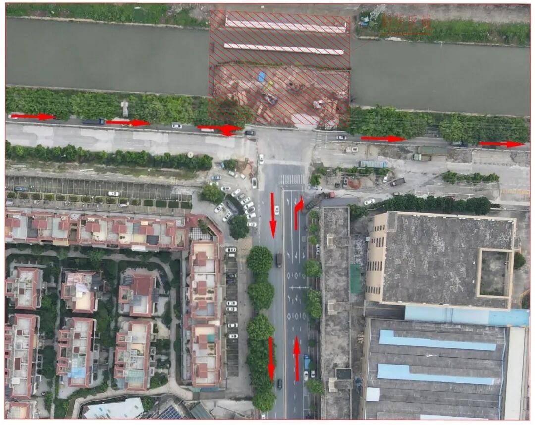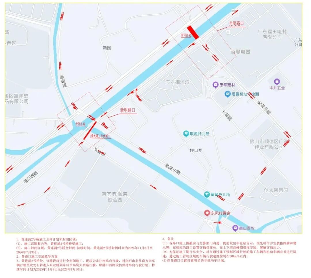 因港口路右幅黄连涌2#桥(右幅辅道桥)的拆除重建及主线桥19#~22#桥墩施工,现将原港口西路东风工业大道路口至新明路路口段进行全封闭施工,施工工期为2025年11月8日至2026年7月30日。