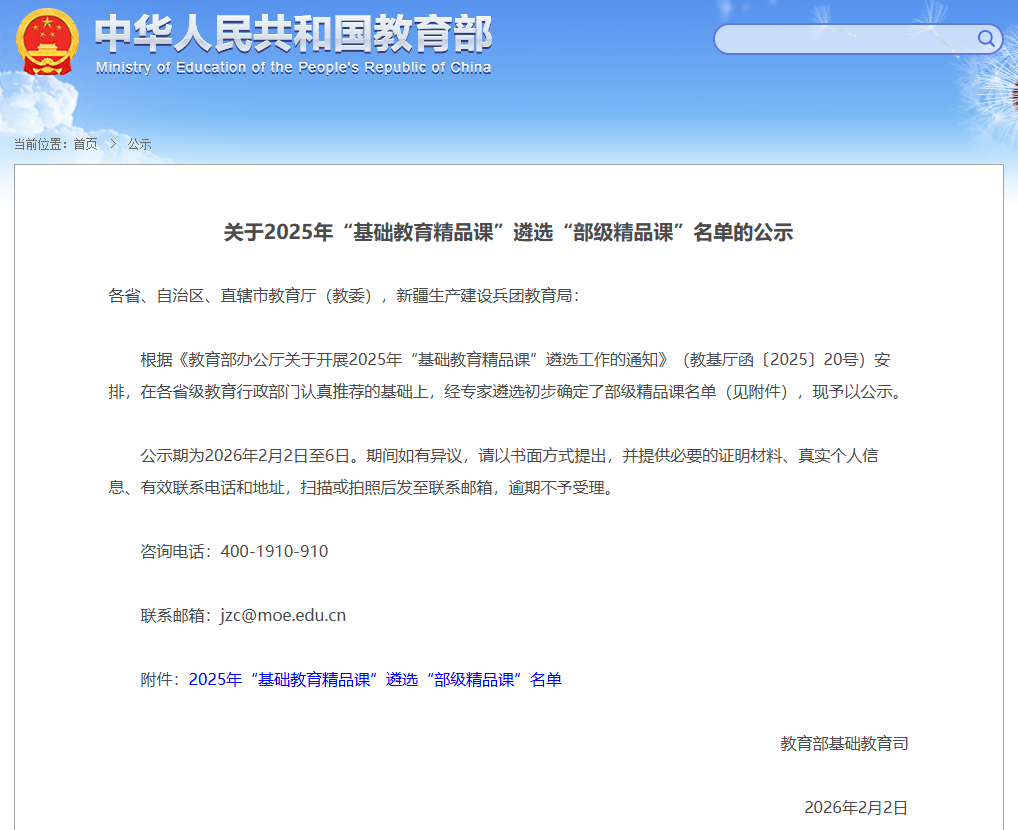日前,教育部发布《关于2025年“基础教育精品课”遴选“部级精品课”名单的公示》,经教育部组织专家遴选,初步确定了2025年基础教育精品课部级精品课名单并予以公示。