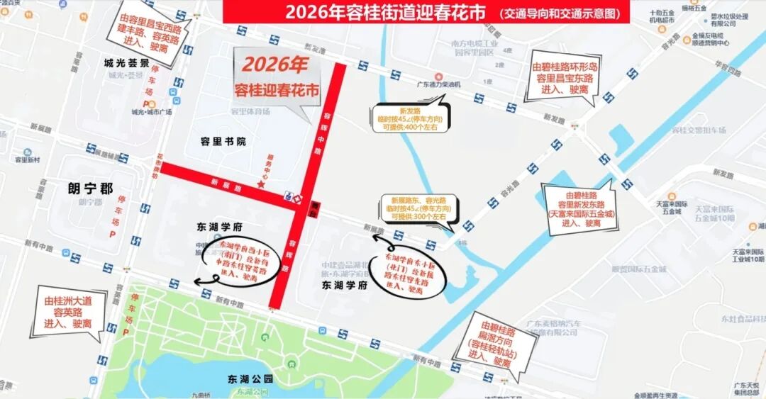 容桂迎春花市周边有临时停车场及路边停车位,请遵循指示规范停放车辆。