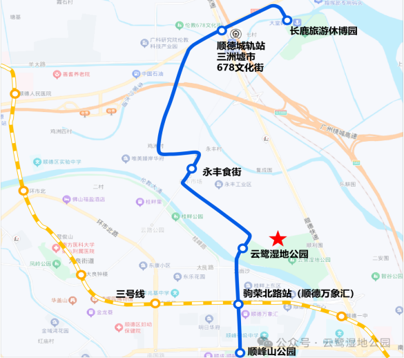 停靠站点(上行/下行) :长鹿农庄、广珠城轨顺德站、永丰市场、云鹭湿地公园、东乐路海山路口、顺峰山公园;