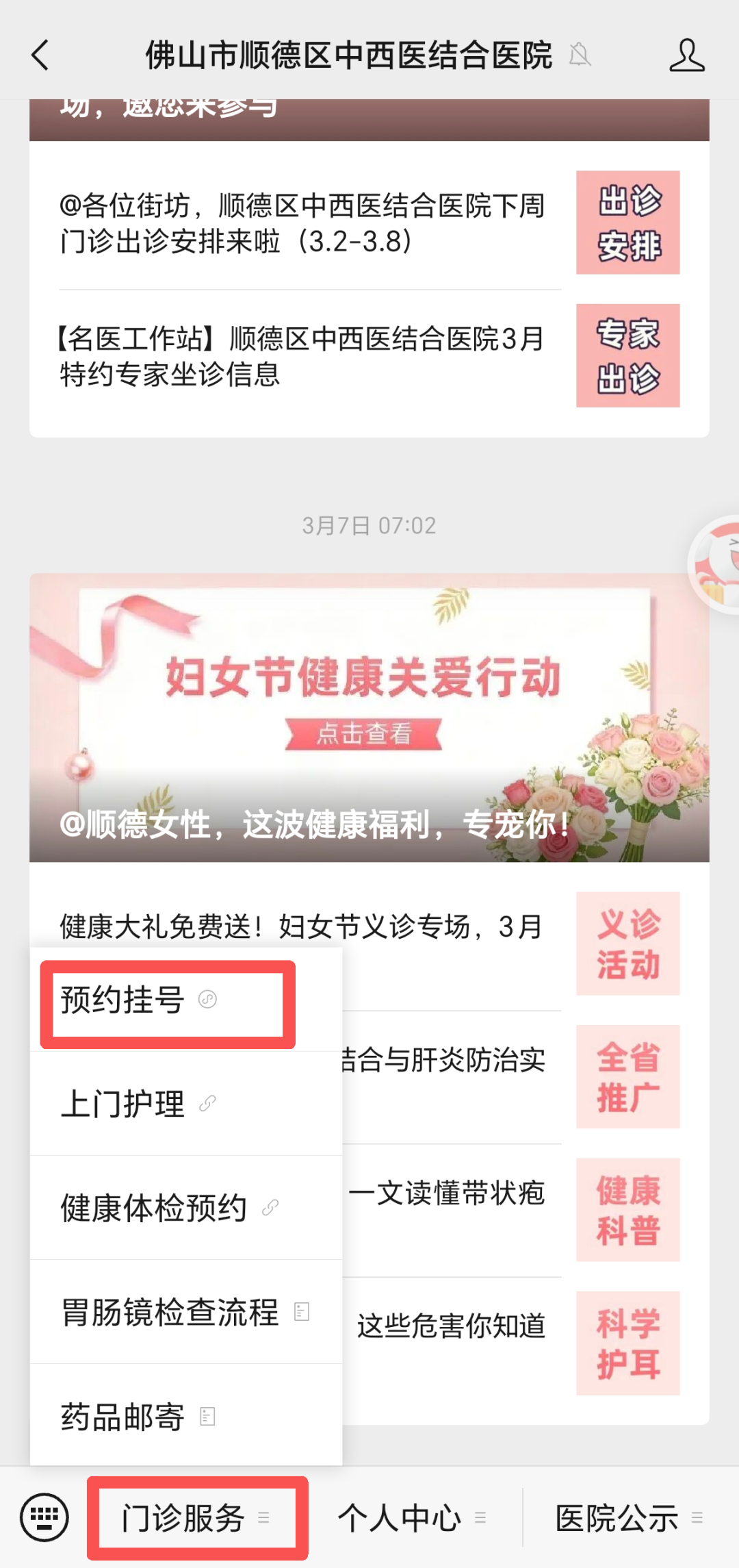 1.打开顺德区中西医结合医院微信服务号---点击【门诊服务】---选择【预约挂号】进入小程序。