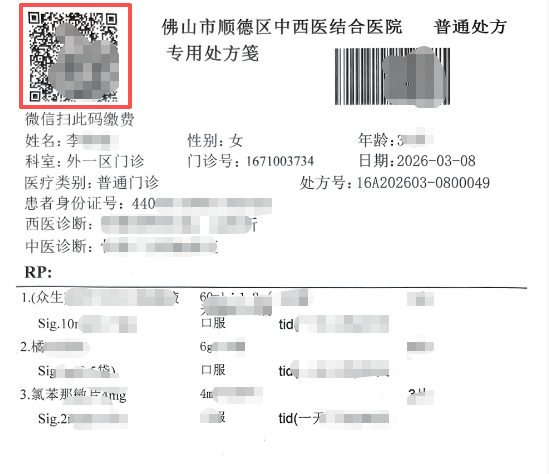 3.处方单缴费。使用微信的扫一扫功能扫处方单上的二维码进入待缴费页面。