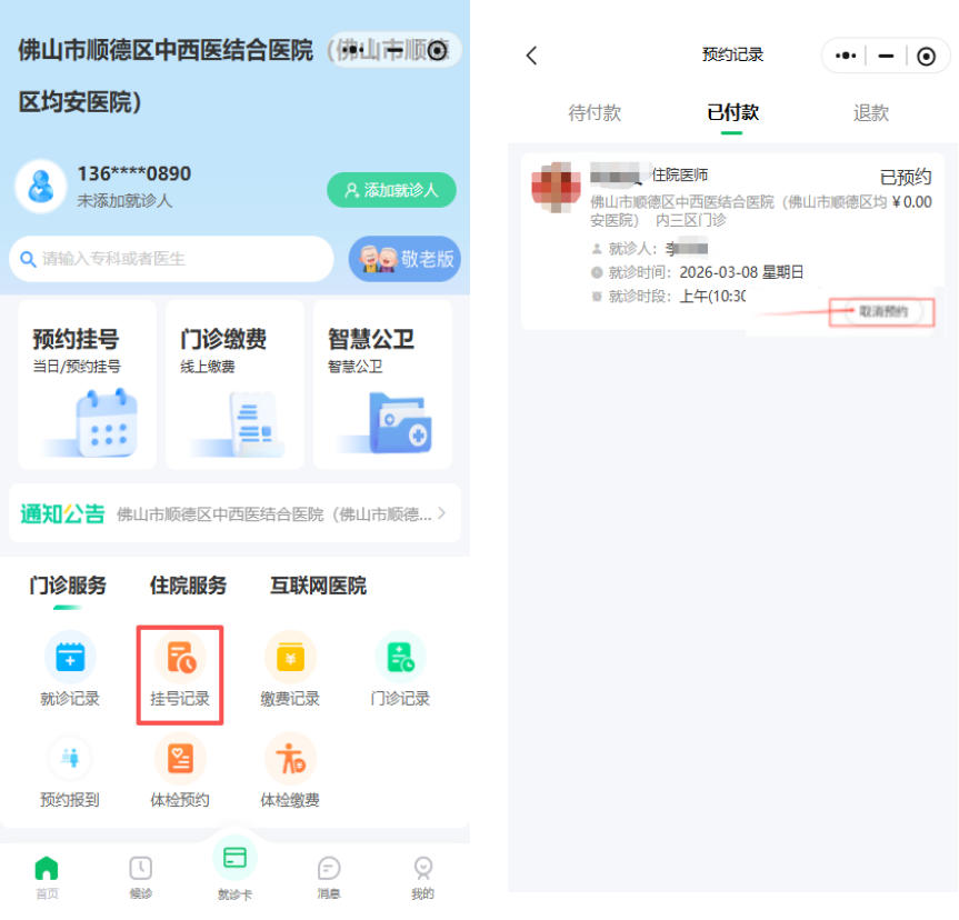 1.进入医院小程序,支持在预约就诊时段前取消预约。