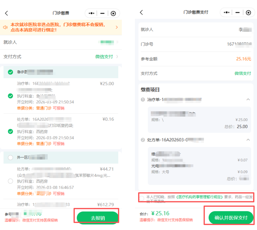 核对费用之后点击“去报销”——“确认并医保支付”。